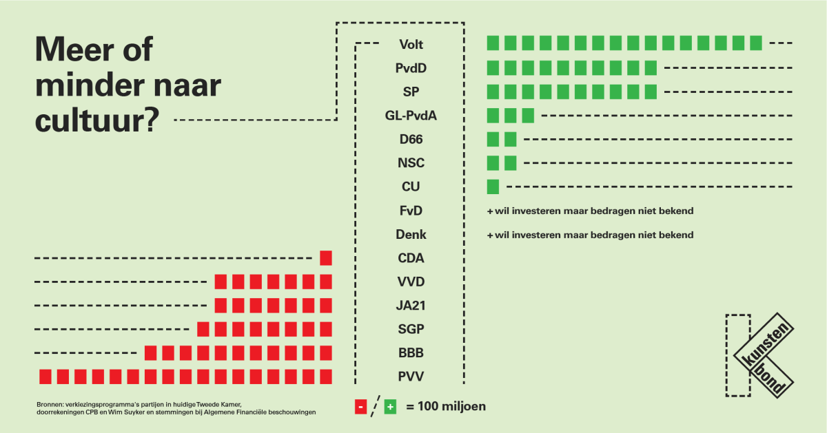 De Kunstenbond presenteert onderstaande heldere infographic. In een oogopslag is duidelijk welke partijen wel of juist geen stevige plek willen voor kunst, cultuur, erfgoed en de creatieve sector in een volgend kabinet. Peter van den Bunder van de Kunstenbond: “Wij hopen dat deze infographic helpt om zichtbaar te maken wat er op het spel staat. Ga stemmen op 29 oktober, want de verschillen zijn groot!”.